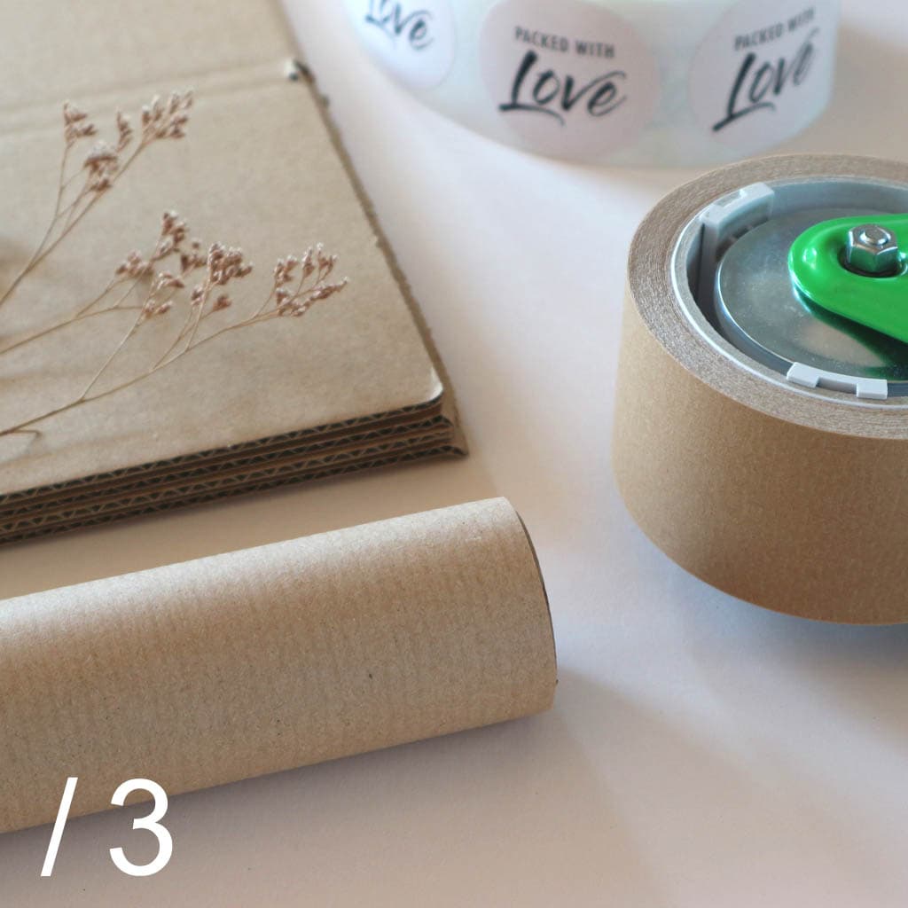 Unsere Kartonagen verschließen wir mit umweltfreundlichem Klebeband aus Papier. Auch die Aufkleber bestehen aus Altpapier. (Bild /3). So kann die gesamte Verpackung im Altpapier entsorgt und daraufhin stofflich wiederverwertet werden.